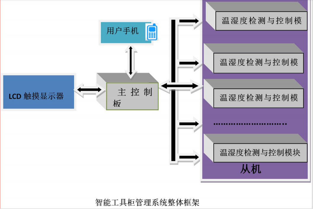 智能工具柜管理系統(tǒng)由 LCD 觸摸顯示屏、主控制板,多個(gè)從機(jī)模塊(溫濕度采集控制及工具位置信號采集)組成,具有以下功能特點(diǎn):