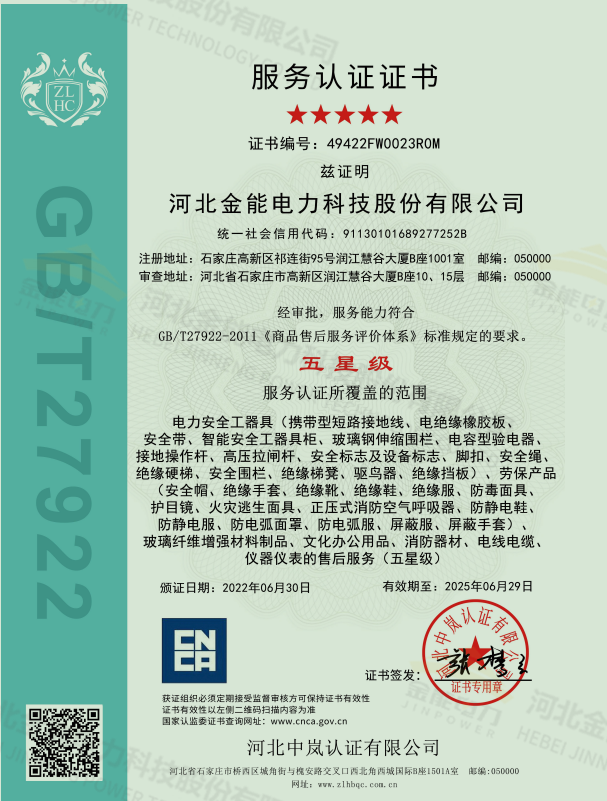 金能電力榮獲五星級服務認證證書